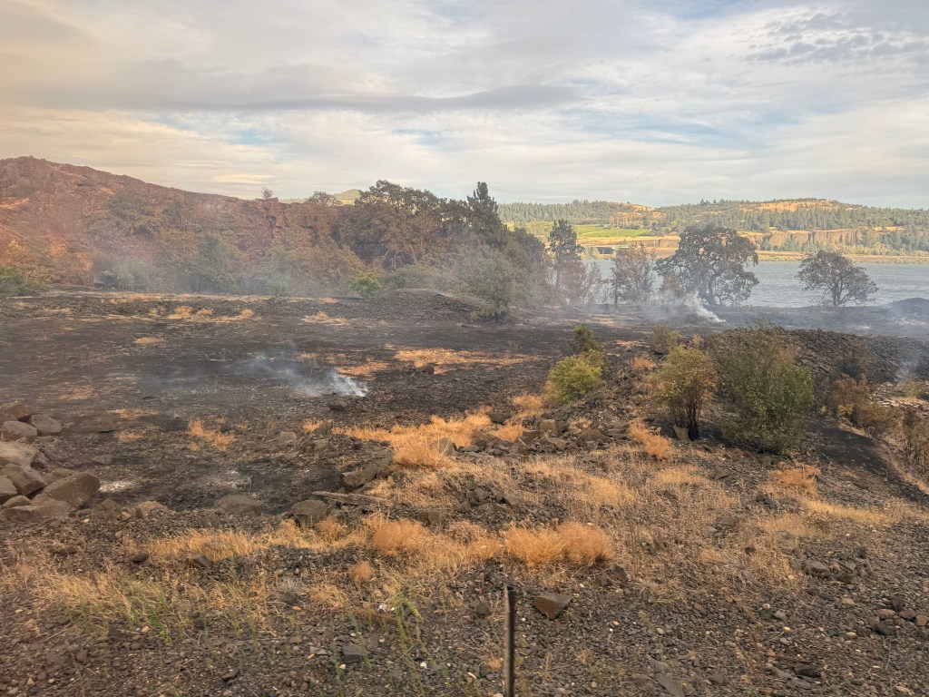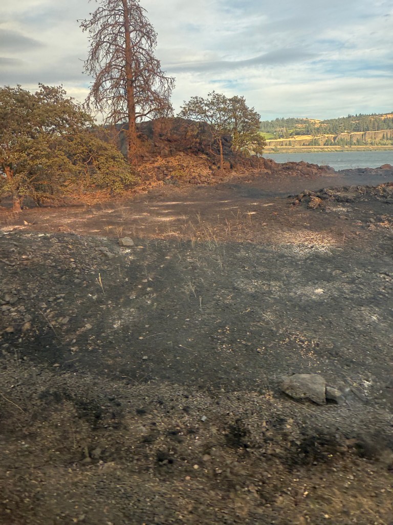 But first I had to get out of Vancouver. The Empire Builder picked me up in Vancouver WA at 5pm. However, at 2:30pm that afternoon, the Boudin fire had erupted in the Columbia Gorge directly on our path. We stopped in White Salmon so the conductor could meet with local officials. Their wisdom was we could continue on two conditions. First, we would have to go no faster than 5 mph for the next 5 miles. Second, the train’s ventilation system would have to be turned off so the smoke would not be ingested into the train. Slowly we proceeded, and although the fire was only a few hours old it had already decimated miles of land on either side of the track.